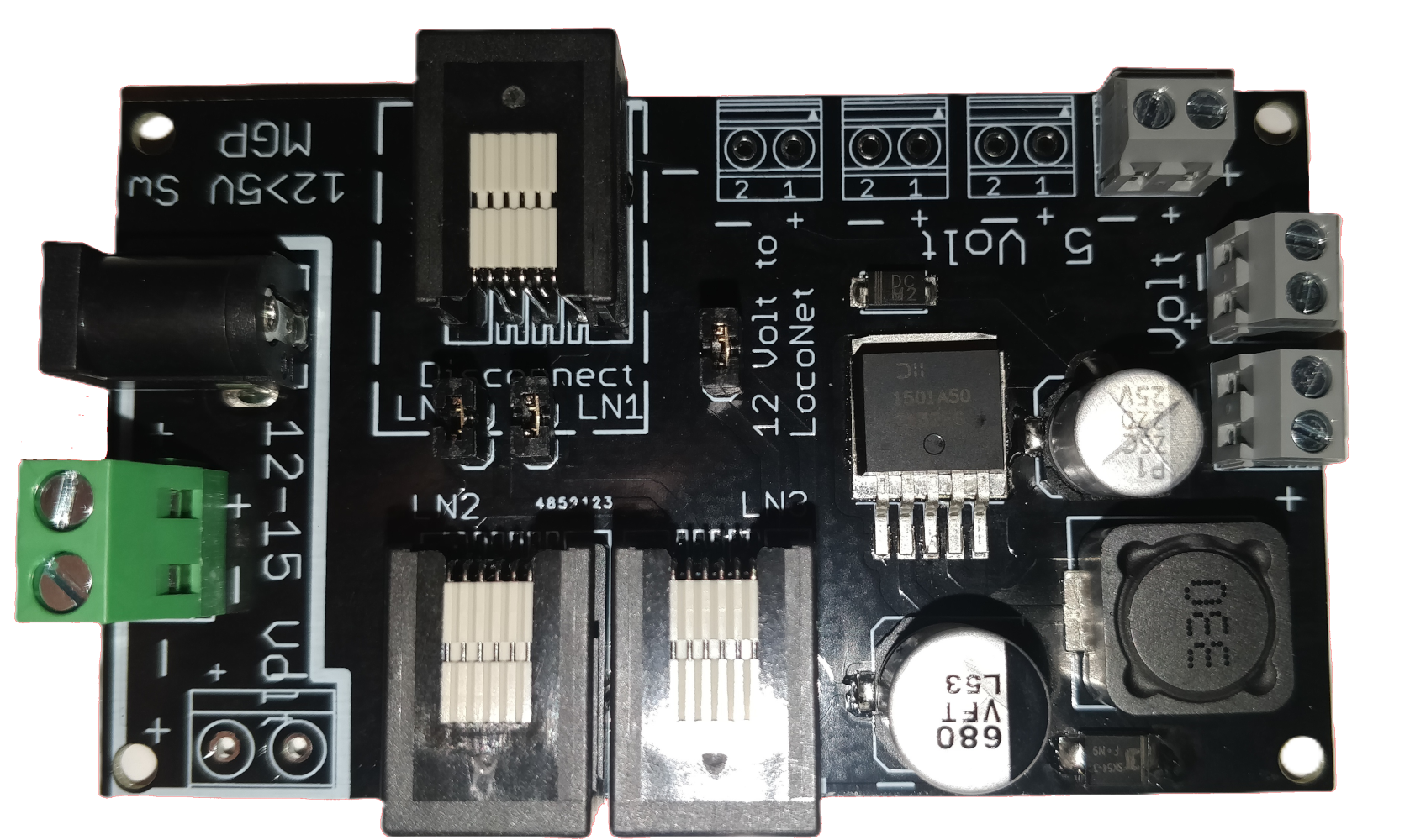 Detta kort matas med 12 Volt och har ett antal uttag för 5 Volt.
